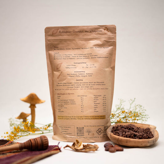 Kakao, griech. Theobroma Cocoa, enthält nach wissenschaftlichen Erkenntnissen bis zu 1200 chemische Bestandteile. Darunter zählen Magnesium, Eisen, Zink, Vitamin C und Serotonin. Kakao ist ein Superfood, welches u.a. als natürliches Antidepressivum und Aphrodisiakum wirkt. Durch den Kakao aktiviertes Dopamin und Serotonin führt zu einem Wohlbefinden und wirkt stimmungsaufhellend. Auch das Hautbild kann durch regelmäßigen Kakaokonsum verjüngen.