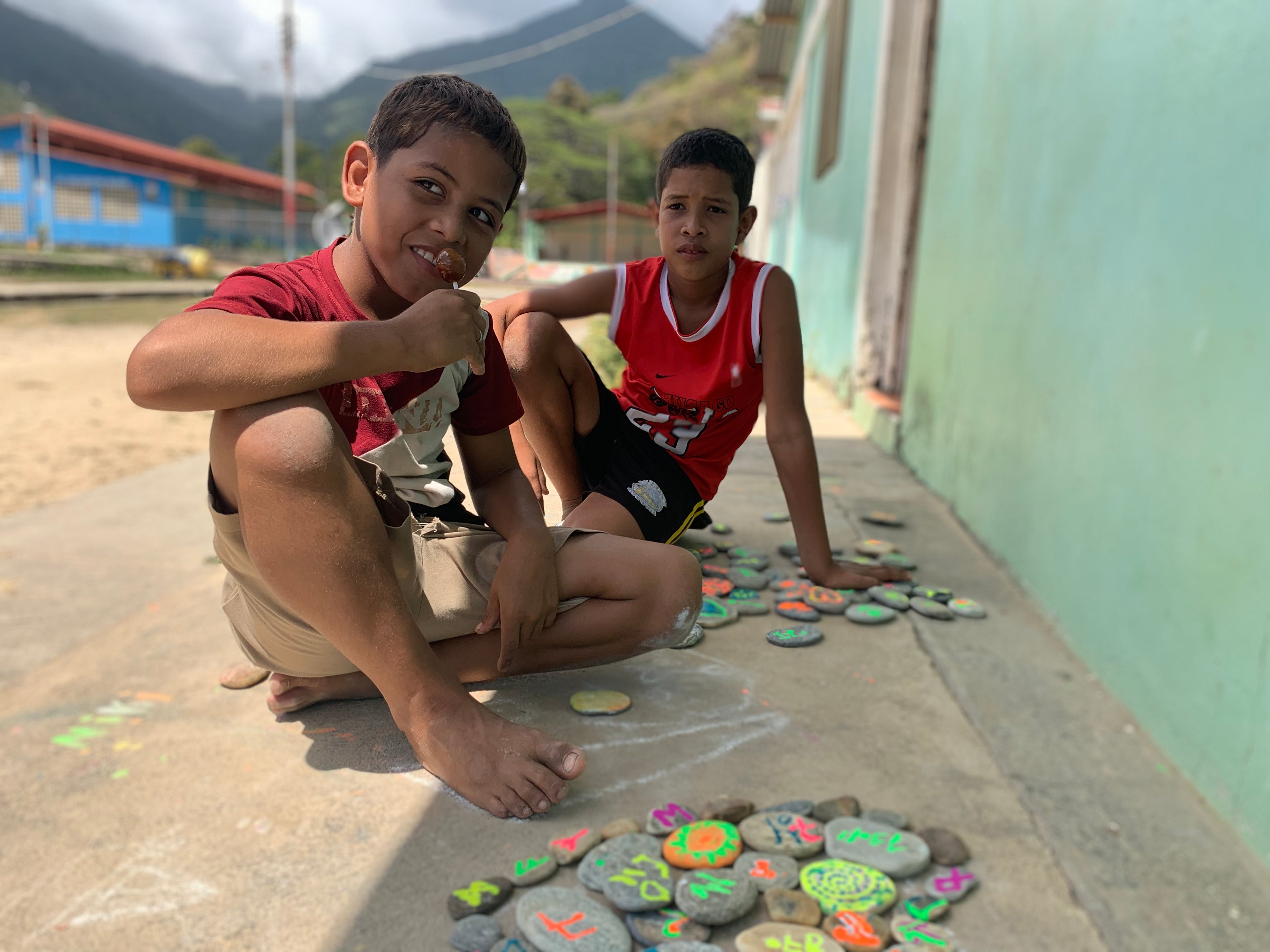 Juan und Diego malen Steine für unsere Bäume an